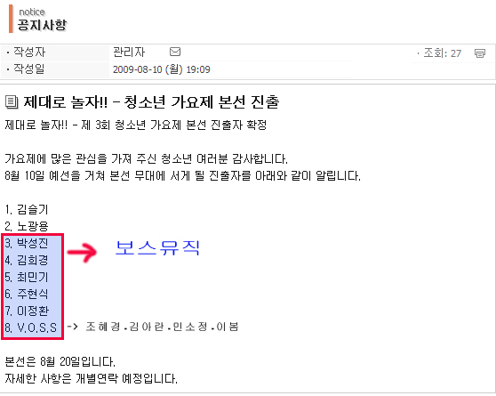 70¿©¸í ¿¹¼± Âü°¡¿¡... 8¸í º»¼±ÁøÃâ! 6¸í(¹Ú¼ºÁø, ±èÈñ°æ,Ãֹαâ,ÀÌÁ¤È¯,ÁÖÇö½Ä ¿©¼ºÁßâÆÀV.O.S.S) VOSS¹ÂÁ÷ Çлý ÀÔ´Ï´Ù. ÃàÇÏÇÕ´Ï´Ù. º»¼±¿¡¼ ÁÁÀº°á°ú ÀÖ±æ ¹Ù¶ø´Ï´Ù^^ -À½¾ÇÀÌ ÀÖ¾î Áñ°Å¿î VOSS¹ÂÁ÷-